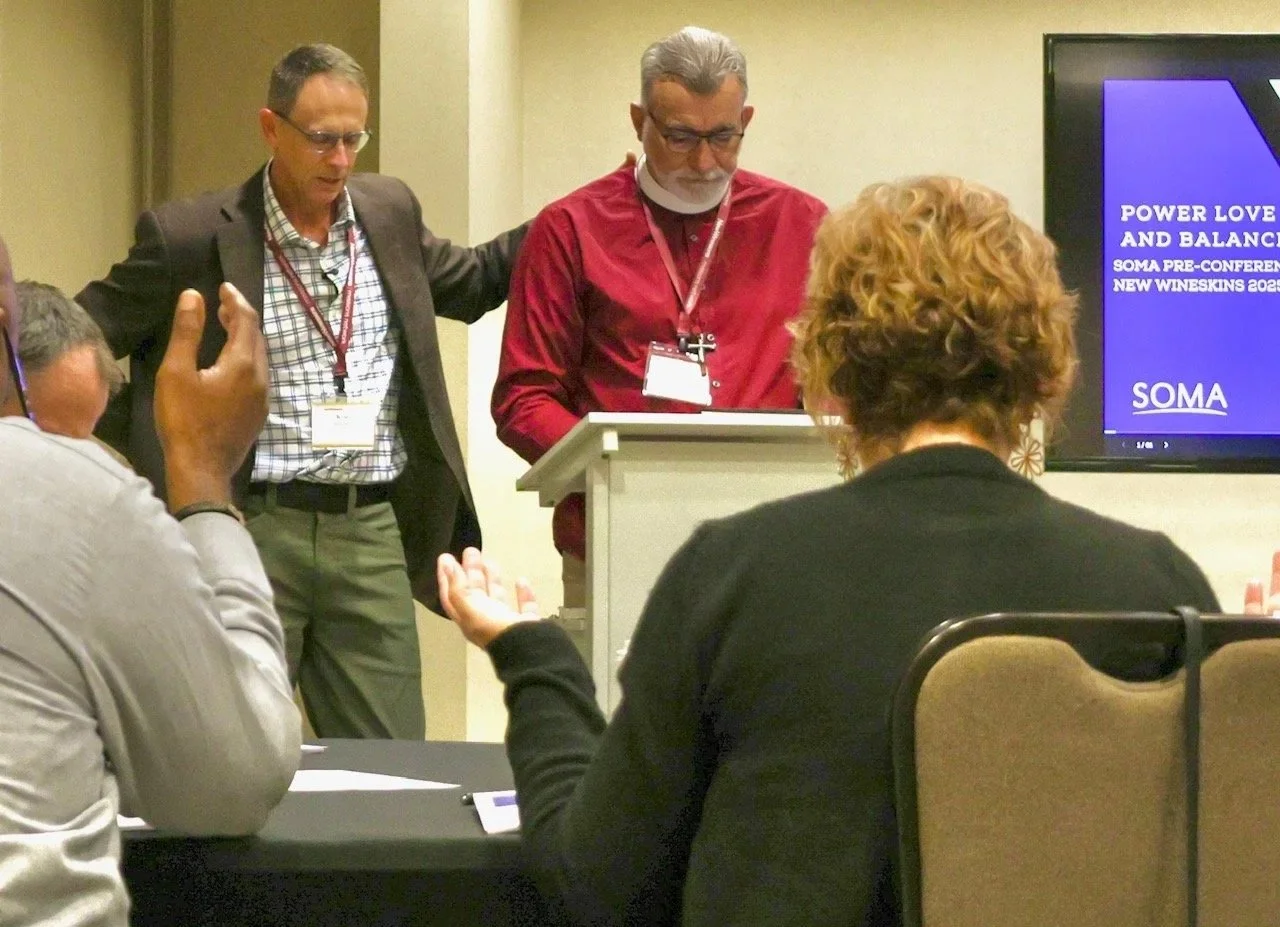 The next morning, SOMA facilitated a pre-conference led by Archbishop Miguel Uchoa. When we broke for lunch, I went to SOMA’s exhibit for supplies. As I approached the table, I saw a long box leaning against it. Guess what it was? SOMA’s brand new banner! When I looked at the label, there wasn’t a recipient name other than the conference center. “no name” was written in Sharpie on the top. With over 60 exhibitors, how did the box labeled “no name” end up on my table?
